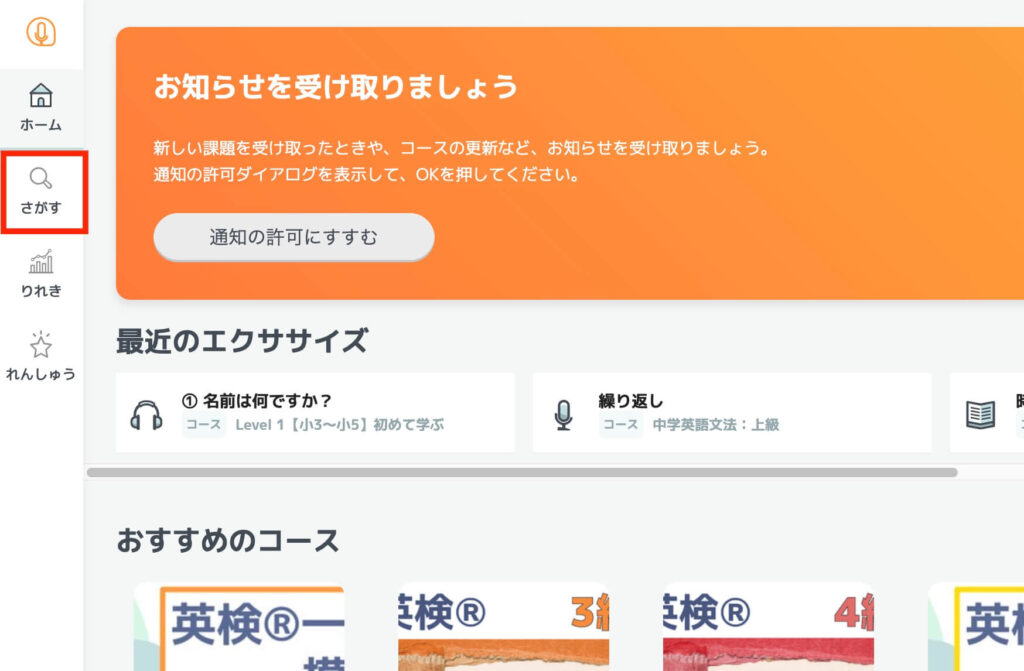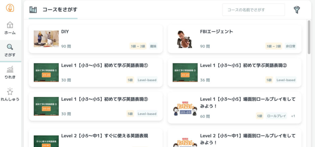 学校で学習する英語、日常会話、英検対策など、教材は目的別に用意され、AI指導つきのスピーキングはフィードバックがすぐ返ってくるので一人で発音練習が可能です。家庭学習にフィットする“続けやすい英会話環境が整います。