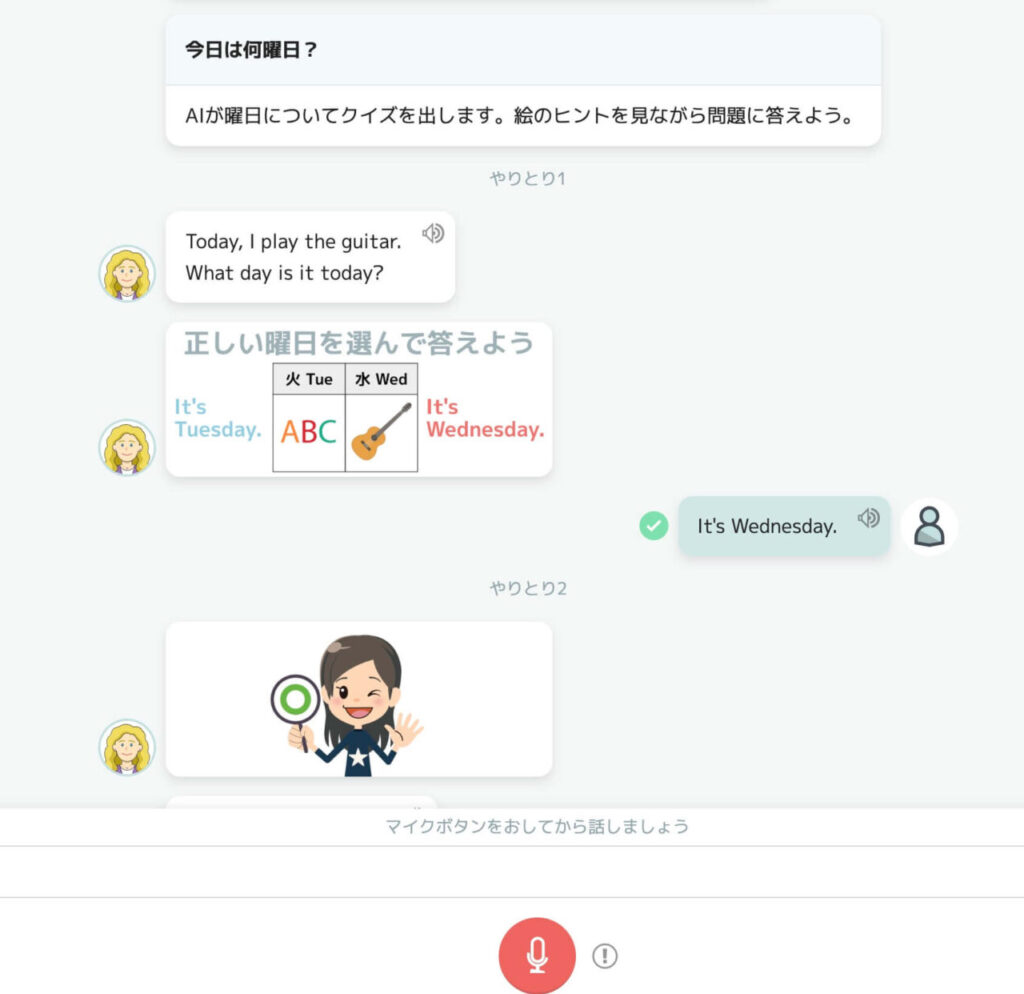 娘は、自分の発音が正解だと、画面で褒めてくれるので、ゲーム感覚で楽しく進めていました。しかもAIが発音をチェックしてくれるので、わかりやすい。5〜10分で完了するので、無理なく“英語を口に出す習慣”がつきそうな教材でした。