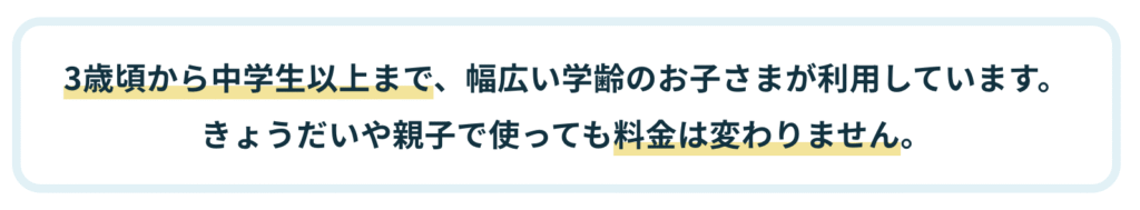 公式サイトによると「3歳頃から中学生以上まで、幅広い学齢のお子さまが利用しています。」と明記されているため、ユーザーは3歳のお子さんもいるということになります。
