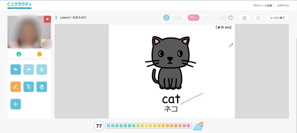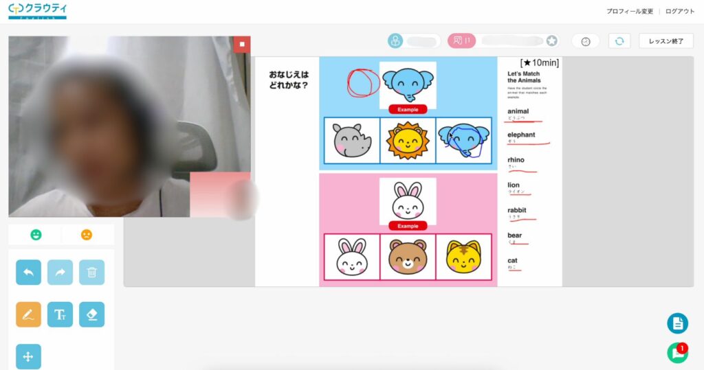 実際に3歳の娘が受講したときは、最初に先生と一緒に挨拶を交わし、いくつかの動物の名前をリピートするところから始まりました。その後、先生が「Encircle the blue elephant.」と指示すると、娘は画面上でゾウのイラストに丸をつけることができました。さらに「線を引く」「色を選ぶ」などのアクティビティが続き、単語学習を繰り返しながらも飽きることなく楽しめていました。