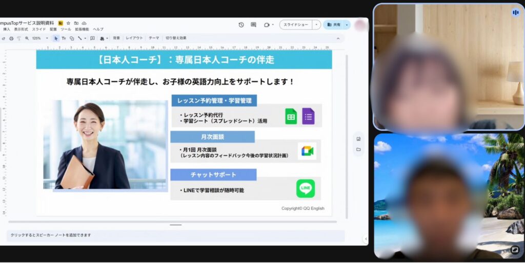 キャンパストップでは日本人コーチが一人ひとりに専属でつき、学習管理や進捗確認を行います。レッスン録画をチェックした上でのフィードバックや、家庭の事情に応じたスケジュール調整も可能。