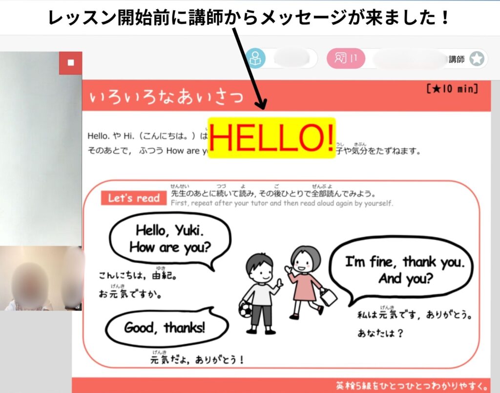 レッスン開始前には、画面に「Hello!」のメッセージが講師から届きました。これで娘もテンションが上がります。