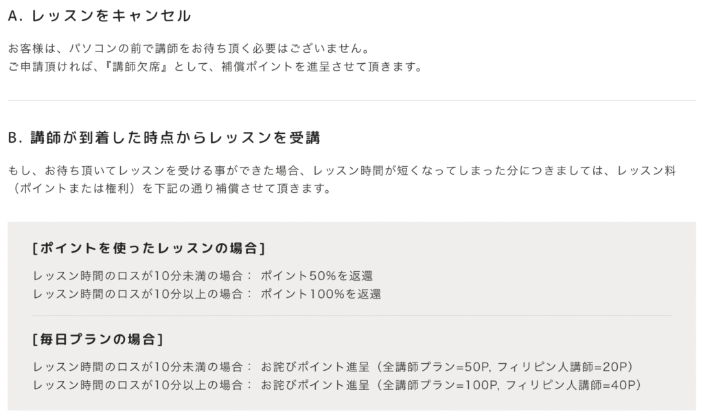 | 12時間以内 | ポイント50%消費 | ①ポイント全額返還+ ②無料振替レッスン提供 |